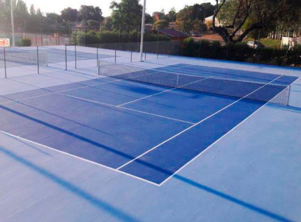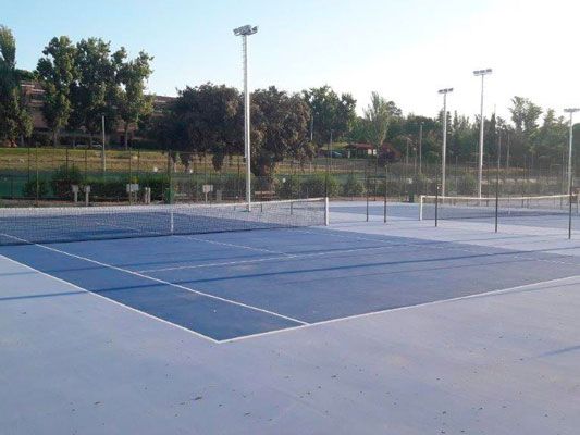 La obra consiste en la reforma de unas pistas de tenis para mejorar las instalaciones y adecuarlas a las necesidades actuales para conseguir unos espacios seguros y adaptados a la práctica deportiva. Durante la obra, se han instalado canaletas en los bordes exteriores para la recogida de pluviales y formación de solera de hormigón semipulido, con caída desde la divisoria de cada pareja hacia las canaletas.