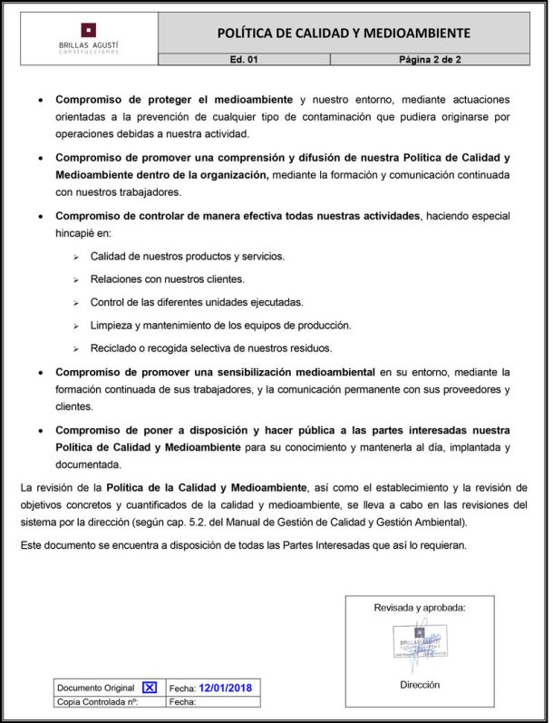 Nuestra filosofía de trabajo está orientada hacia la calidad total y en consecuencia a la satisfacción del cliente, y es por ello que en CONSTRUCCIONES BRILLAS AGUSTI, S.A. hemos decidido dar un paso más e implantar un sistema de Gestión Integrado de Calidad y Medio Ambiente basado en las normas UNE-EN-ISO 9001:2015  y UNE-EN ISO 14001:2015 .
