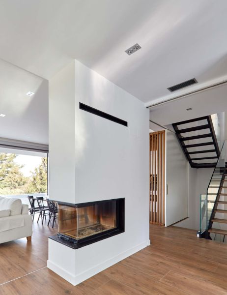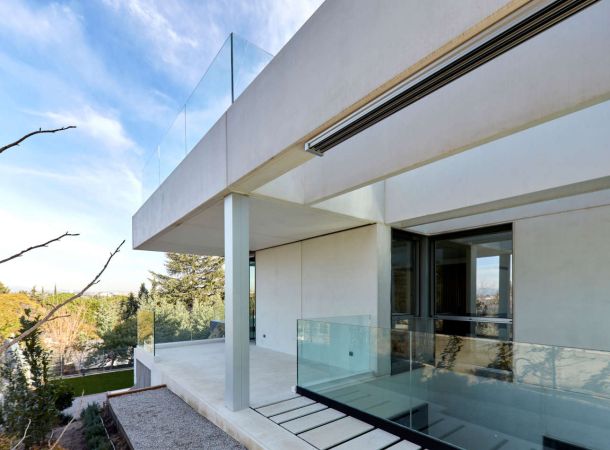 En la planta baja, encontramos una espectacular piscina cubierta, un salon y sala de estar y una cocina que cuenta con todo lo imprescindible para poder disfrutar del espacio. En la primera planta, encontramos la zona de dormitorios, la cual dispone de un vestidor y baños. Por último, en la segunda planta, tenemos el dormitorio de invitados, despachos y el acceso a las cubiertas Algunas características de la vivienda son sus fachadas de GRC, sistema Stud Frame, cubiertas planas transitables con acabados en pavimento de madera, grava de marmolina o ajardinadas, todo con unas espectaculares vistas a la sierra.