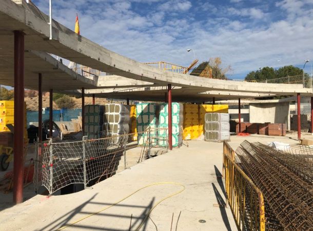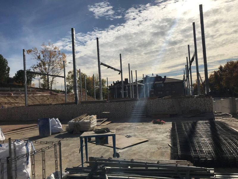 La cimentación de las pistas se ejecuta sobre firme, realizando pozos de hasta 5,00 m. de profundidad desde la cota de cimentación, y se soluciona con zapatas aisladas y vigas riostras, sobre las que se colocan las placas de anclaje de estructura metálica de pistas, entre zapatas y riostras se llevan los pasatubos de instalaciones de agua y electricidad, y la instalación de saneamiento, posteriormente se ejecutará una base de zahorra compactada para apoyo de pistas de hormigón. La zona edificada se ejecutará con estructura de hormigón armado y losas, consta de vestuarios de hombres y mujeres con acabados en porcelánico, piedra natural y cafetería con acabados en porcelánico.