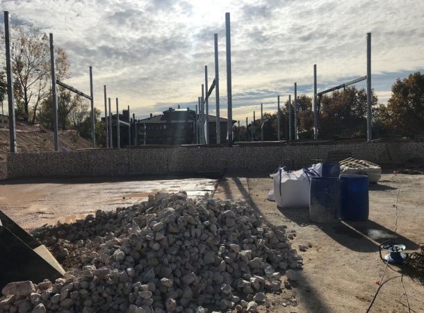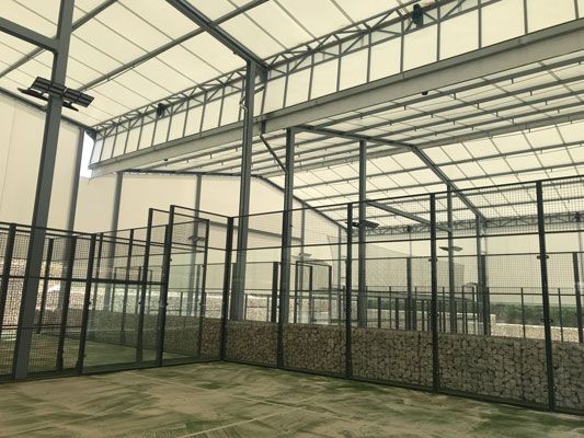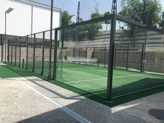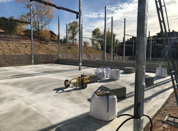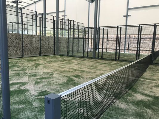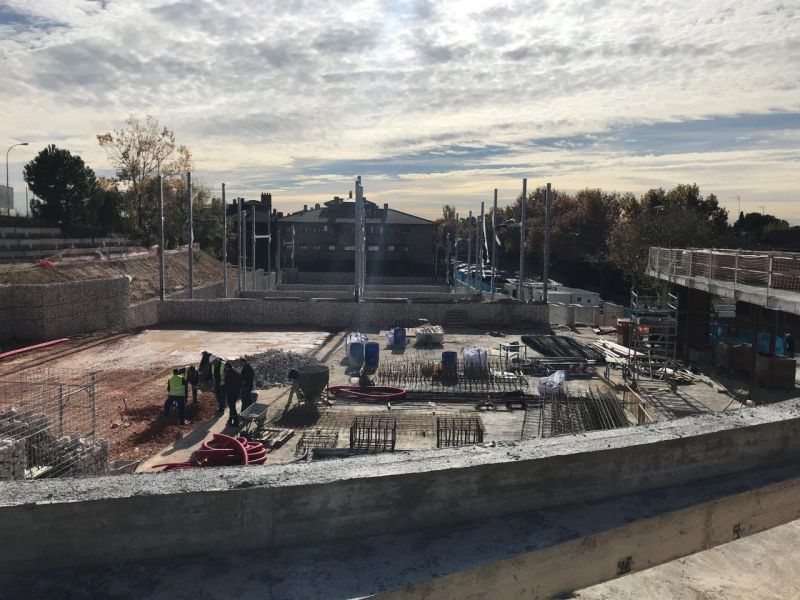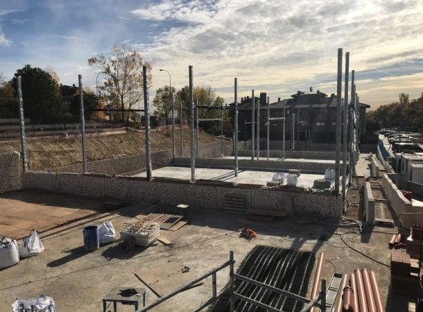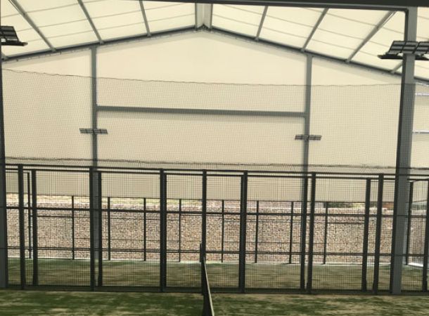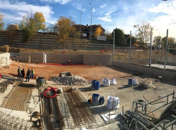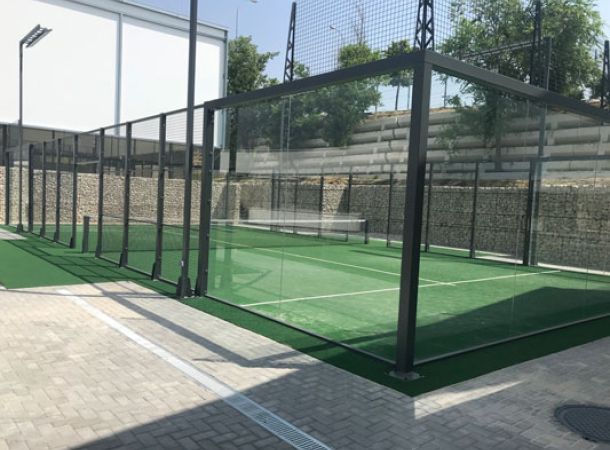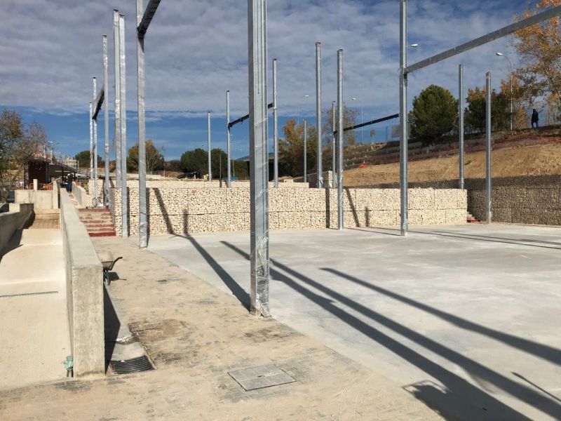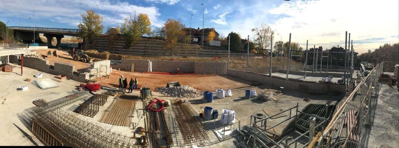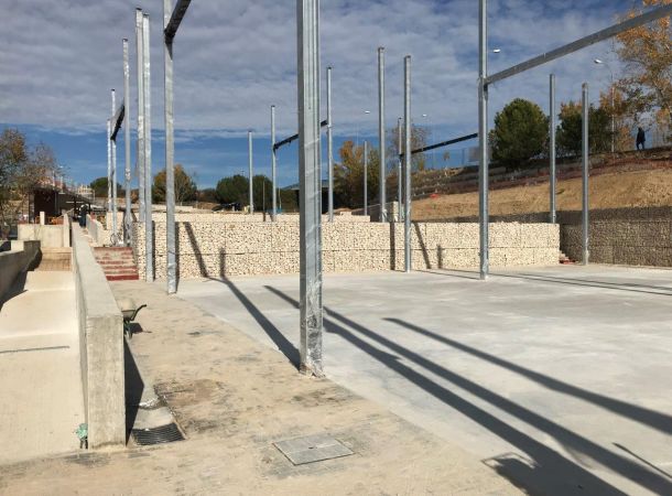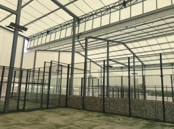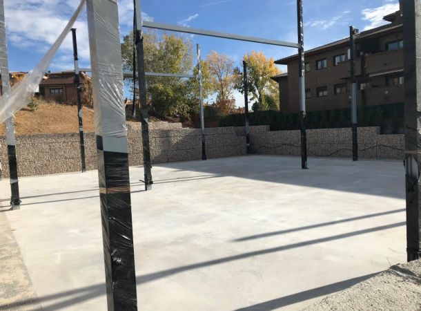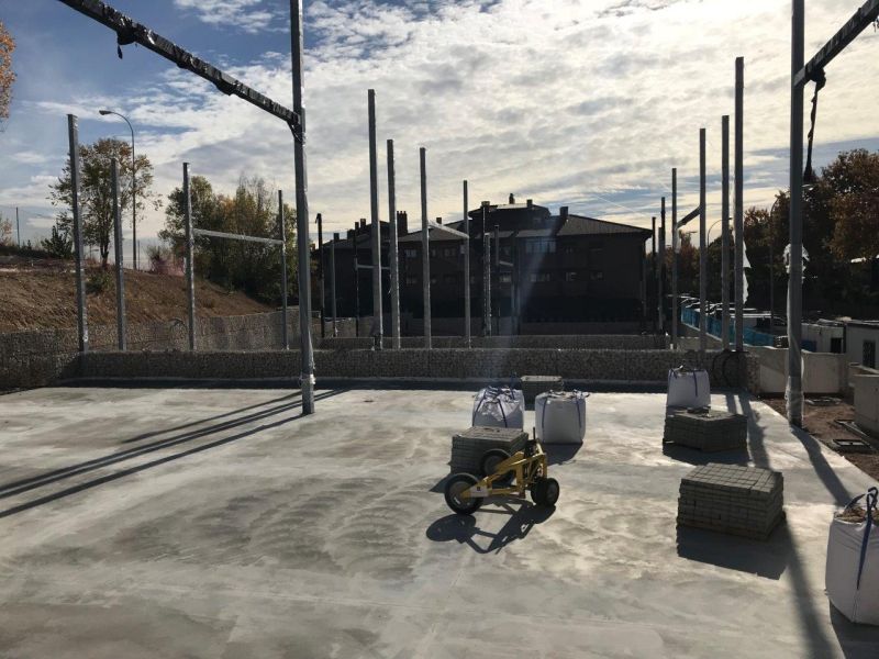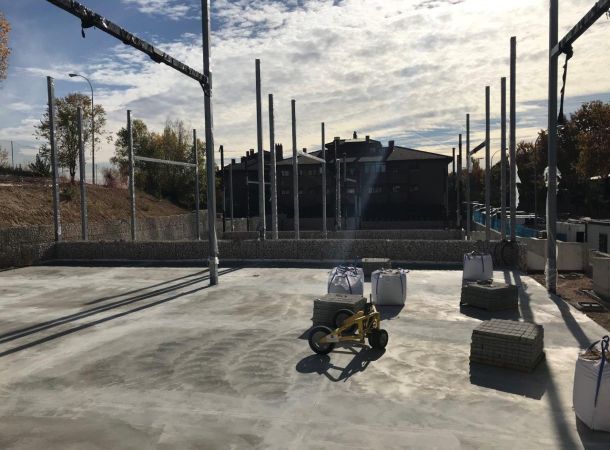 Construcción de ocho pistas deportivas de Pádel, siete de ellas cubiertas, con dotación de vestuarios y cafetería, en parcela de 5069 m2 , en Pozuelo. La obra comienza con la excavación para ejecución de pistas y excavación para edificio de dotación de vestuarios y cafetería con sótano y parking. Los perímetros de la parcela se ejecutan para contención de aceras con muretes de hormigón, y valla tipo hércules, la contención de taludes y diferencias de cotas entre pistas, se solucionan con muros de gavión de piedra caliza de medidas desde 1,20 x 1,20 x 2,00 m. en cimentación, hasta 1,20 x 1,20 x 0,50 m. en coronación, los taludes y medianerías se plantarán con alibustres y tierra vegetal , el conjunto de muros armoniza con la zona verde. Se dispone de una zona de huerto urbano bordeada de muros de gavión, para entretenimiento infantil, así como una zona de juegos.