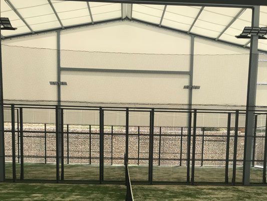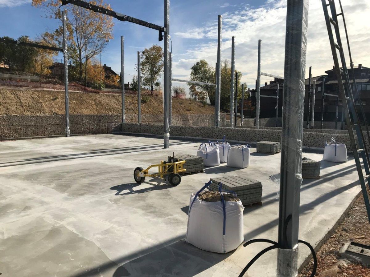 Construcción de ocho pistas deportivas de Pádel, siete de ellas cubiertas, con dotación de vestuarios y cafetería, en parcela de 5069 m2 , en Pozuelo. La obra comienza con la excavación para ejecución de pistas y excavación para edificio de dotación de vestuarios y cafetería con sótano y parking. Los perímetros de la parcela se ejecutan para contención de aceras con muretes de hormigón, y valla tipo hércules, la contención de taludes y diferencias de cotas entre pistas, se solucionan con muros de gavión de piedra caliza de medidas desde 1,20 x 1,20 x 2,00 m. en cimentación, hasta 1,20 x 1,20 x 0,50 m. en coronación, los taludes y medianerías se plantarán con alibustres y tierra vegetal , el conjunto de muros armoniza con la zona verde. Se dispone de una zona de huerto urbano bordeada de muros de gavión, para entretenimiento infantil, así como una zona de juegos.
