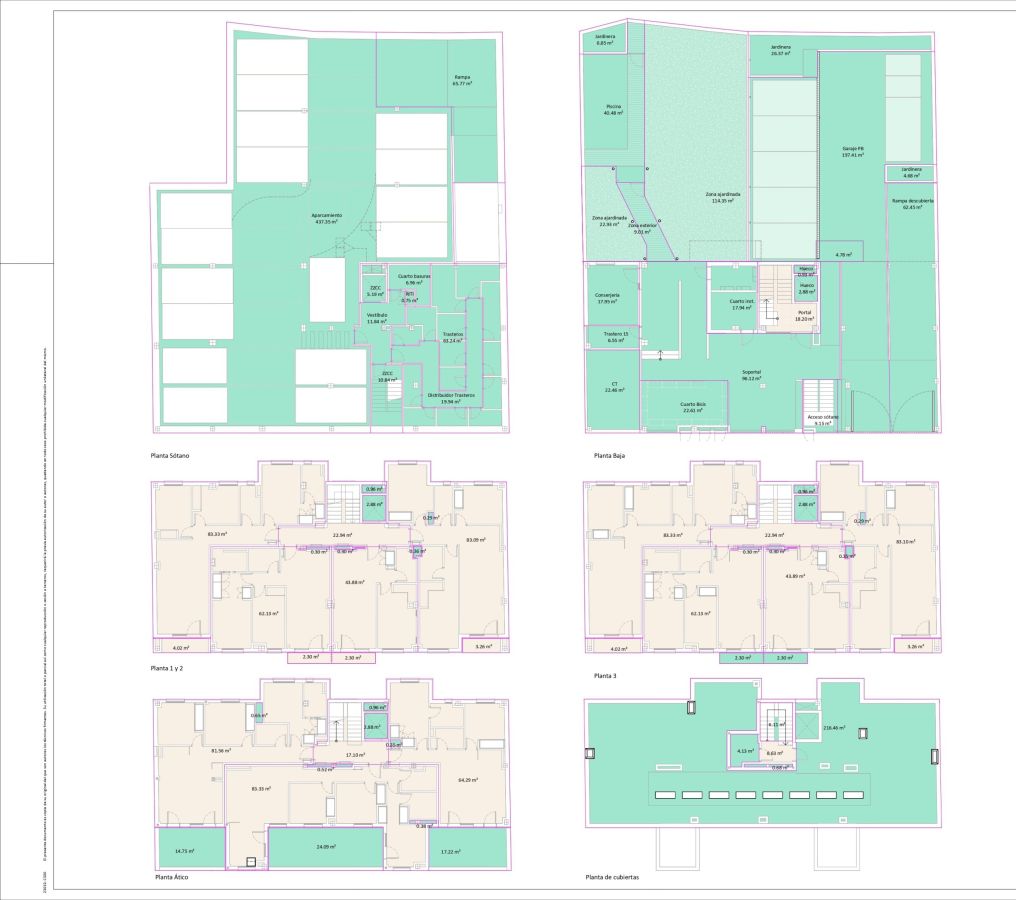 Cubiertas planas transitables en zonas vivideras y terminadas con gravilla en las azoteas, y cubierta ajardinada en planta baja sobre garaje subterráneo.