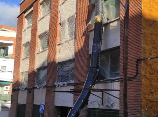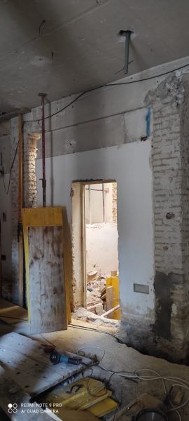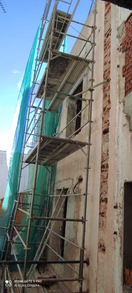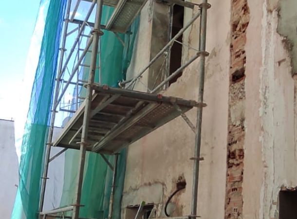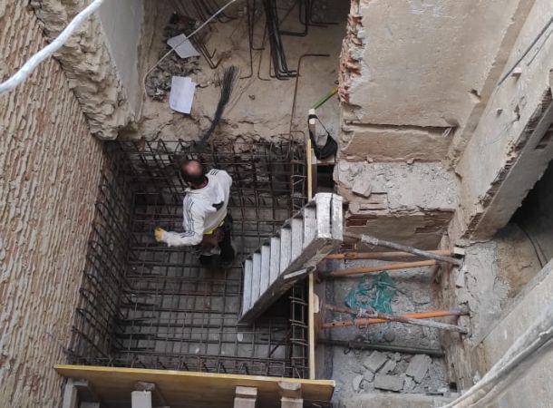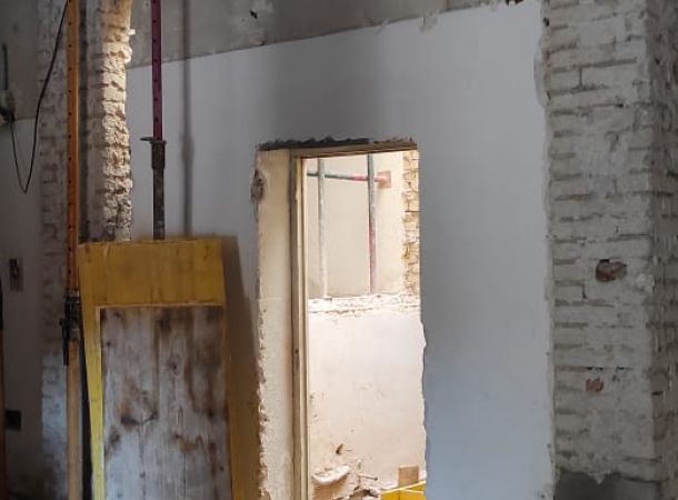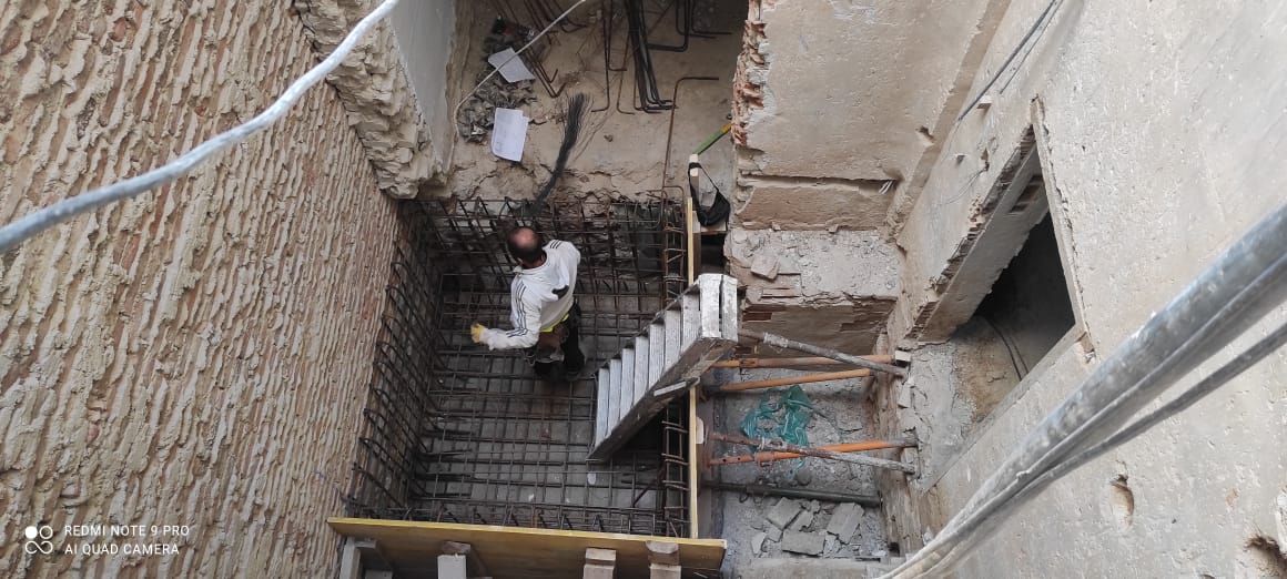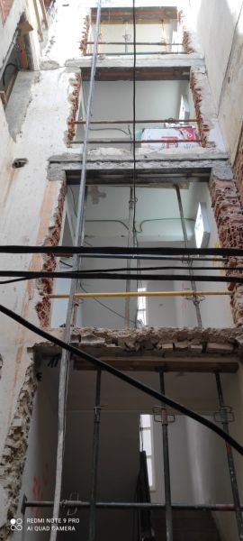 Intervenciones estructurales: apeos de muros de carga, apertura de huecos en fachada, ejecución e instalación de estructura de ascensor en patio interior.