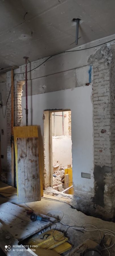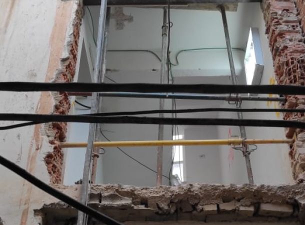 Intervenciones estructurales: apeos de muros de carga, apertura de huecos en fachada, ejecución e instalación de estructura de ascensor en patio interior.