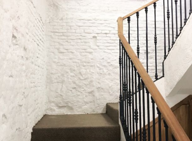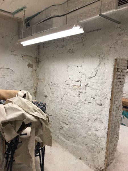 Para consguir una impermeabilización completa en este local, se establece un suministro y aplicación de tres capas de impermeabilizante hidráulico TECMADRY F, de la firma Satecma, aditivado con Cryladit y con una carga de 4 K/M2, en la totalidad de los paramentos. De esta forma, se crea una barrera continua y flexible de estanqueidad a presión negativa, permitiendo la transpiración de los muros y dejando un acabado blanco rústico y lavable de gran dureza.
