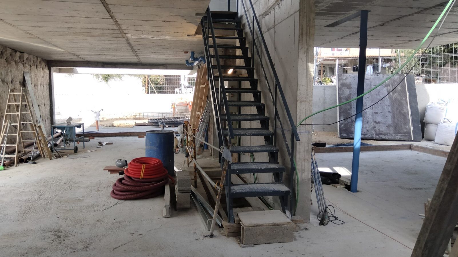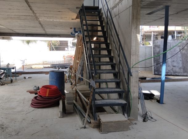 La escalera principal se ejecutará con peldaños metálicos anclados a un muro de hormigón. Posteriormente, los peldaños se forrarán con madera noble. Además, se usarán tensores para la sujeción de las ménsulas.