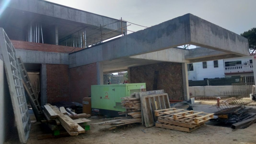 La estructura del conjunto se resuelve con pilares y losas de hormigón. Destaca una viga en voladizo en la prolongación del salón, de 1 metro de canto y 3,60 m de vuelo. El perímetro de la parcela se cierra completamente con muros de hormigón. Estos muros se ejecutan a una cara en las lindes con las parcelas vecinas.