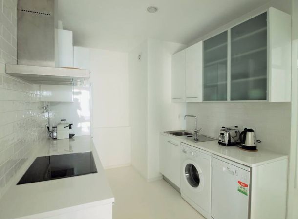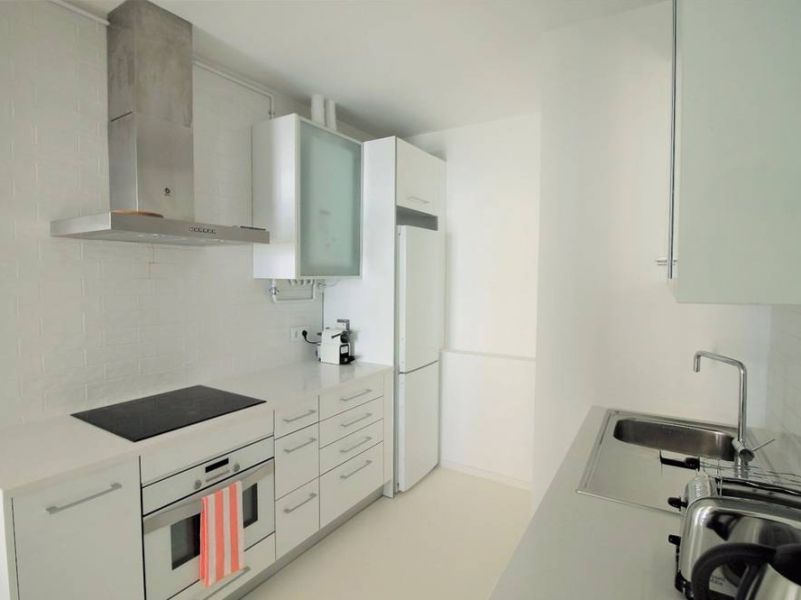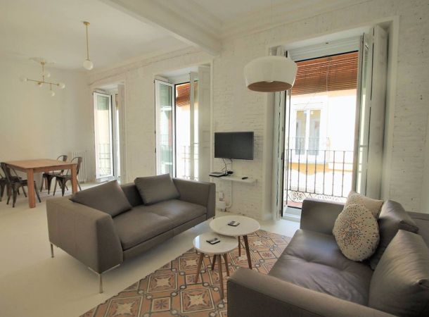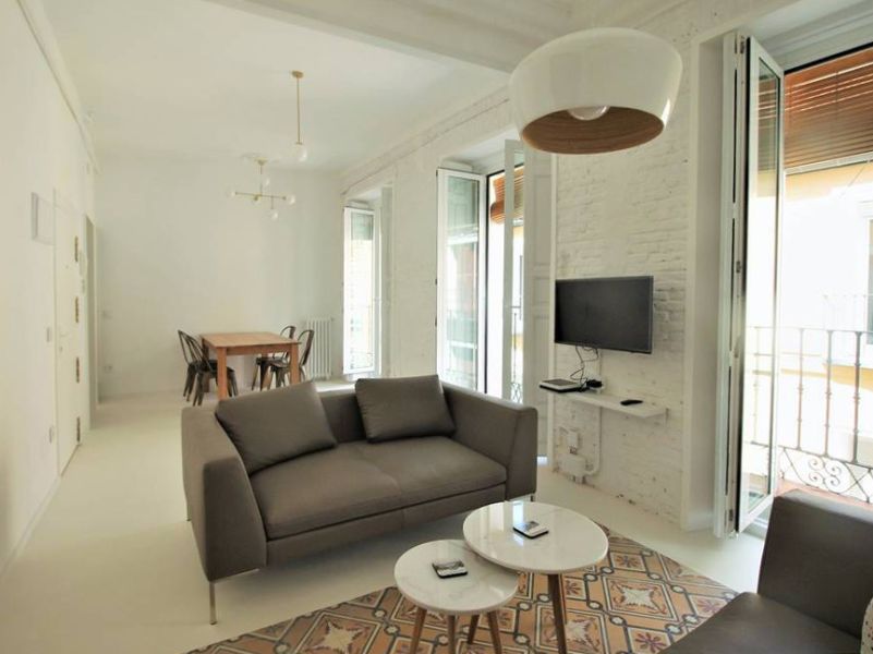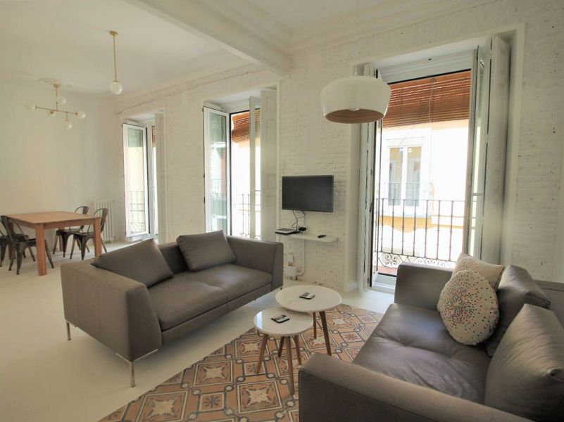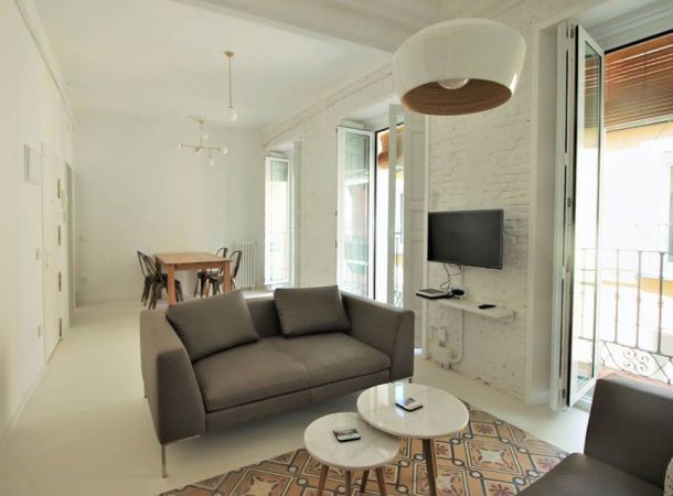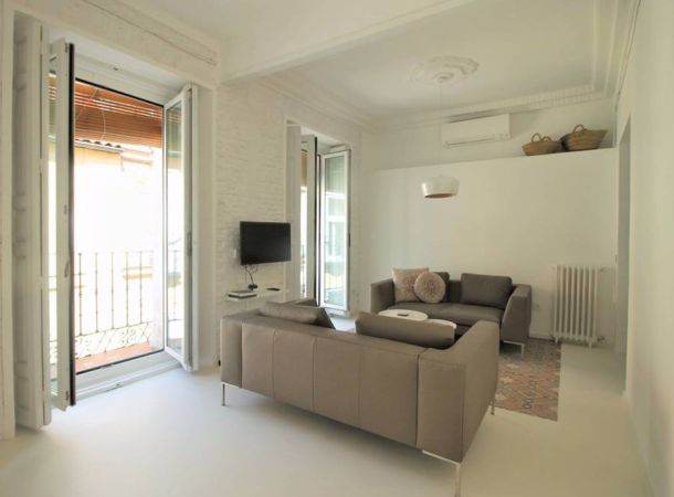 Reforma de vivienda en calle Barco, en el barrio de Malasaña. La reforma ha sido integral, se han recuperado los suelos de baldosa hidráulica existentes en la vivienda y se ha realizado el resto del pavimento con microcemento blanco.