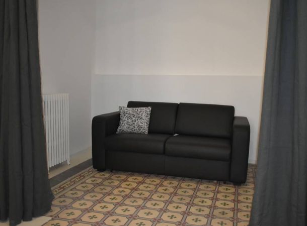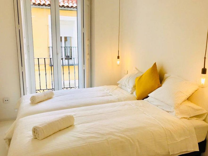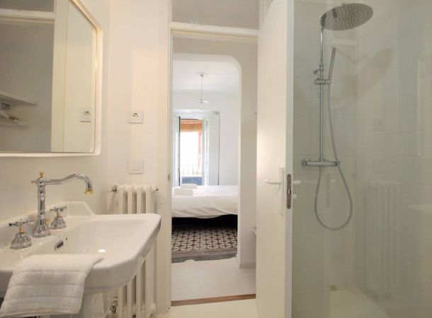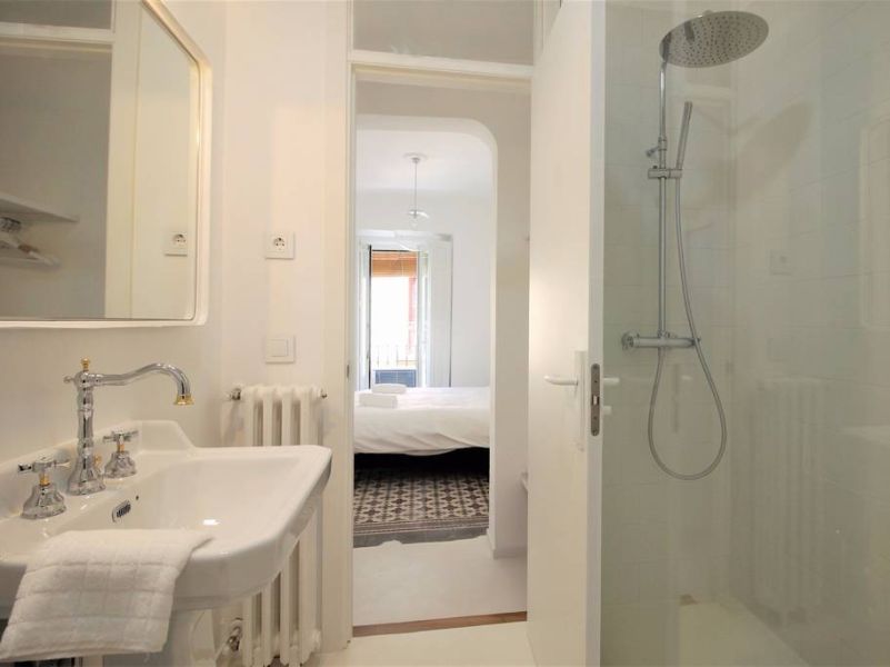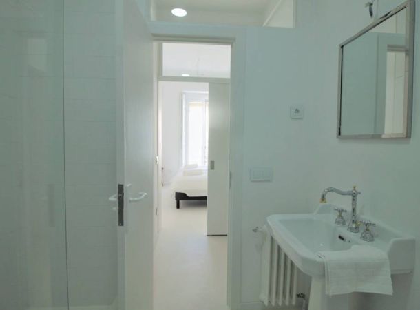 Reforma de vivienda en calle Barco, en el barrio de Malasaña. La reforma ha sido integral, se han recuperado los suelos de baldosa hidráulica existentes en la vivienda y se ha realizado el resto del pavimento con microcemento blanco.