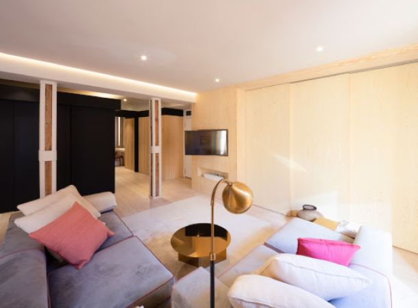 La cocina, unida al comedor y sala de estar, puede dividirse mediante un tabique móvil de madera generando un segundo dormitorio con baño completo independiente. Estores motorizados y escamoteables en techo.