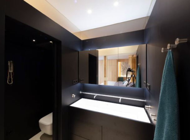 Nada más entrar, en el centro de la vivienda, llama la atención un enorme cubo metálico negro que al abrir sus paredes correderas se descubre un espacio convertible en dormitorio para visitas con ducha independiente. Armarios mimetizados en paredes metálicas y de madera.