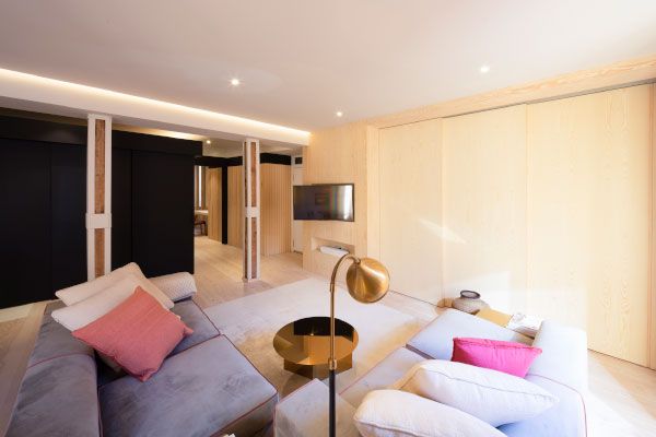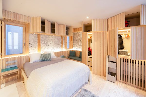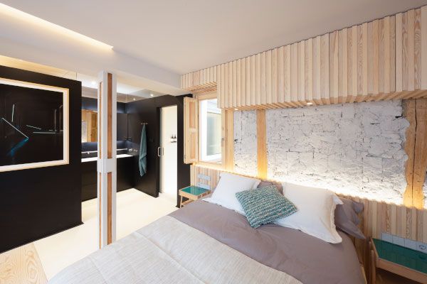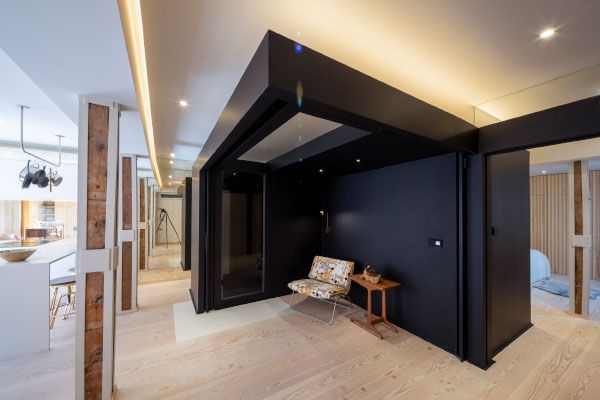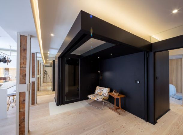 Nada más entrar, en el centro de la vivienda, llama la atención un enorme cubo metálico negro que al abrir sus paredes correderas se descubre un espacio convertible en dormitorio para visitas con ducha independiente. Armarios mimetizados en paredes metálicas y de madera.