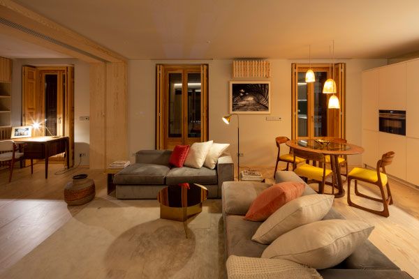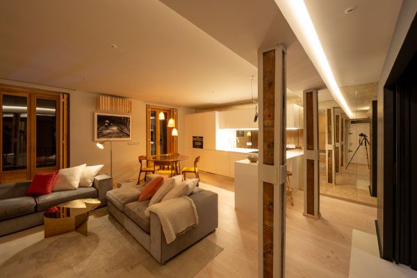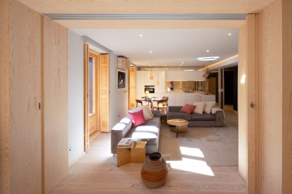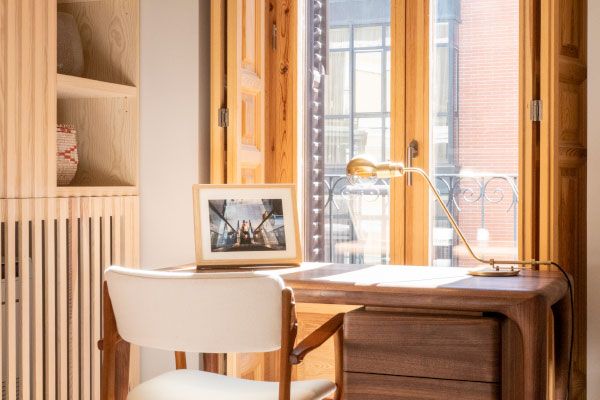Se realiza una importante mejora de la envolvente optimizando aislamientos en cerramientos y duplicando vidrios de ventanas de madera restauradas. Se instalan modernos sistemas de climatización con suelos radiantes y refrescantes con aerotermia, aportando grandes ahorros energéticos, domotizados y controlables desde apps.