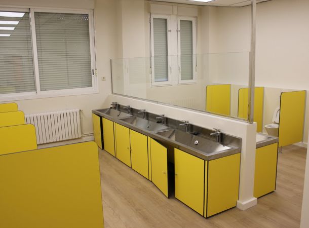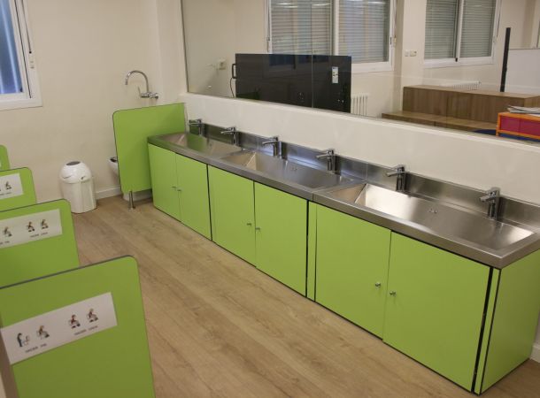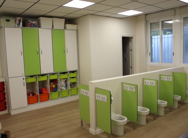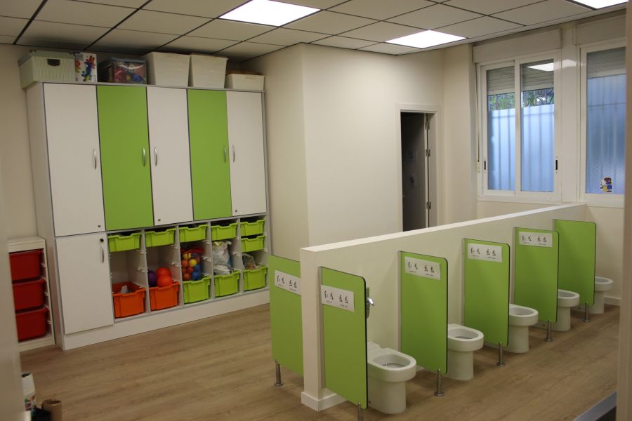 A la hora de reformar el baño de las aulas infantiles, se ha creado una zona adaptada a los más peques para que les resulte cómodo y vayan aprendiendo poco a poco a ir solos al baño. Como puedes observar en las imágenes, todos los baños están a la altura perfecta de los niños y niñas más pequeños, de tal forma que, comiencen a desarrollar habilidades para ir solos al baño.