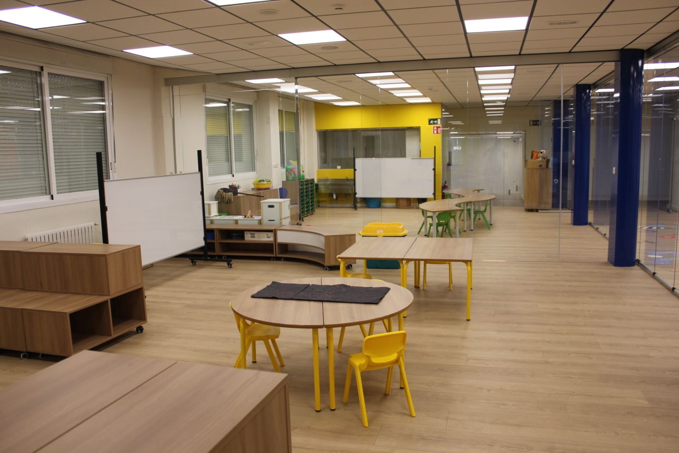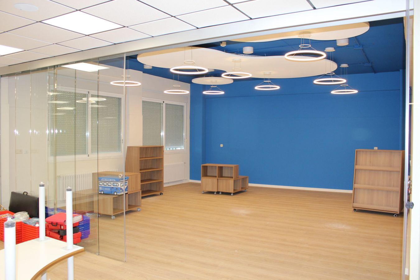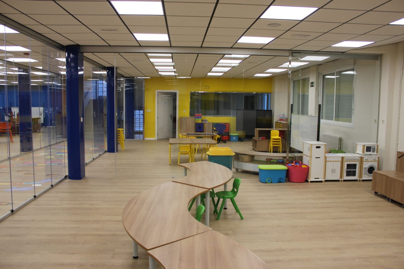 La distribución de las aulas se ha dispuesto de tal forma que, quede una zona amplia donde puedan jugar y divertirse sin ningún tipo de riesgos.