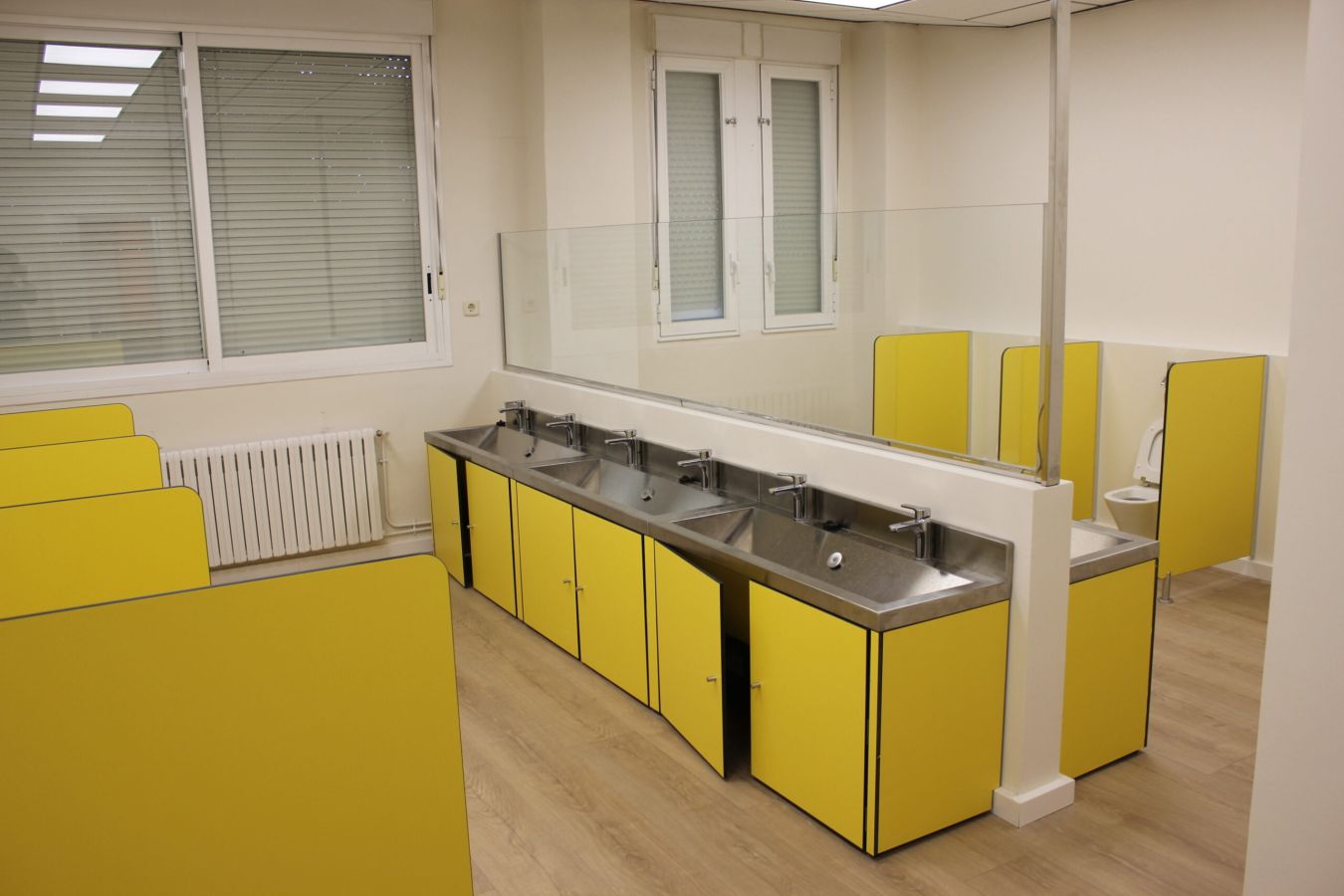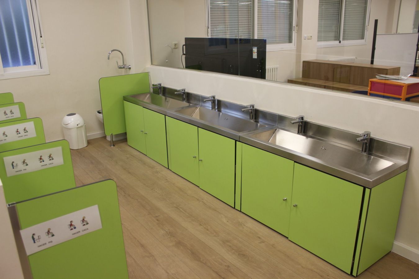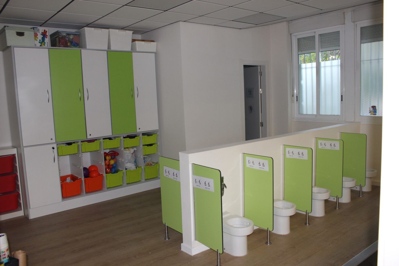 A la hora de reformar el baño de las aulas infantiles, se ha creado una zona adaptada a los más peques para que les resulte cómodo y vayan aprendiendo poco a poco a ir solos al baño. Como puedes observar en las imágenes, todos los baños están a la altura perfecta de los niños y niñas más pequeños, de tal forma que, comiencen a desarrollar habilidades para ir solos al baño.