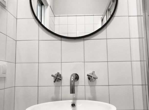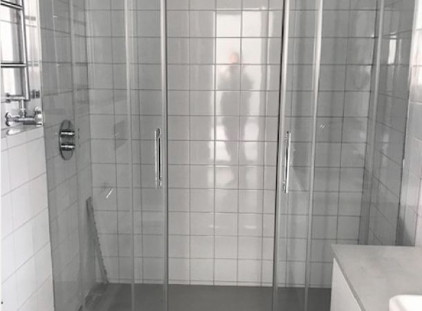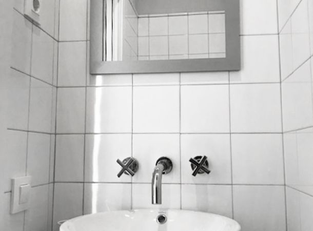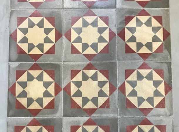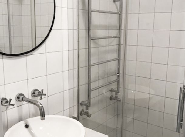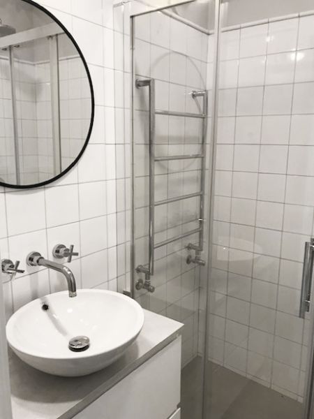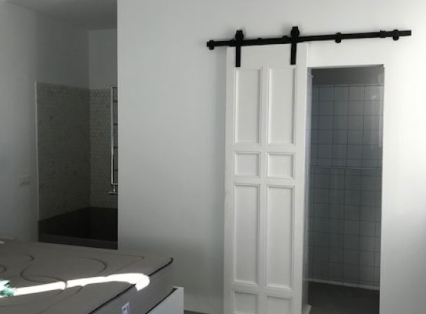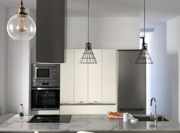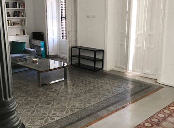 Rehabilitación integral de vivienda de 250 m2 en calle San Agustín. En este caso también hemos podido recuperar los suelos de baldosa hidráulica existentes, el resto del pavimento es de microcemento color gris, incluso la formación de bañeras y duchas. Se dota a la vivienda de caldera de gas natural y aire acondicionado.