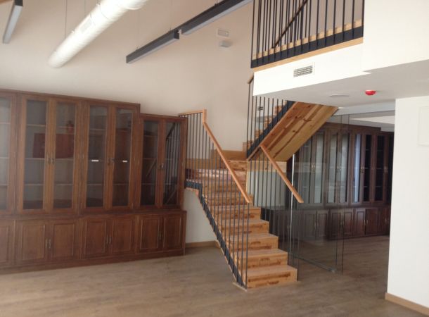 Las divisiones interiores se ha realizado con tabiquería seca tipo Pladur, siendo las carpinterías interiores de madera de haya y los pavimentos de tarima flotante salvo en zonas húmedas. Las carpinterías exteriores se han realizado con aluminio con rotura térmica tanto en el edificio existente como en la parte ampliada, en el edificio existente se han fabricado fraileros de idéntico diseño a los que inicialmente tenía el edificio.