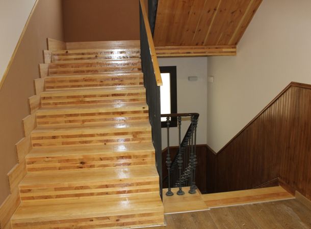 Las divisiones interiores se ha realizado con tabiquería seca tipo Pladur, siendo las carpinterías interiores de madera de haya y los pavimentos de tarima flotante salvo en zonas húmedas. Las carpinterías exteriores se han realizado con aluminio con rotura térmica tanto en el edificio existente como en la parte ampliada, en el edificio existente se han fabricado fraileros de idéntico diseño a los que inicialmente tenía el edificio.