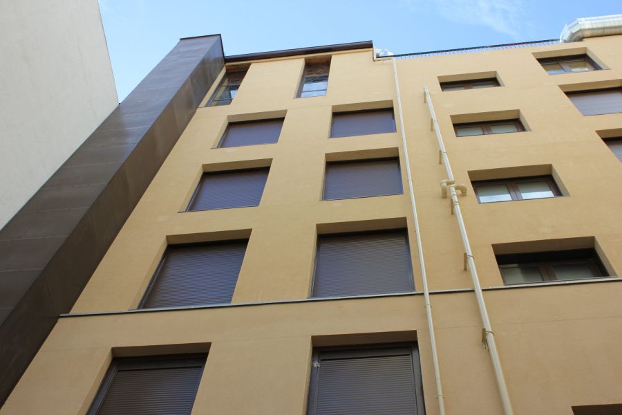 En el edificio existente se ha procedido a la restauración de los elementos protegidos, respetando su composición original, y en las plantas ampliadas se ha optado por una fachada ventilada de piedra caliza en la fachada principal y un acabado de fachada tipo Sate para las fachada interior y medianeras.