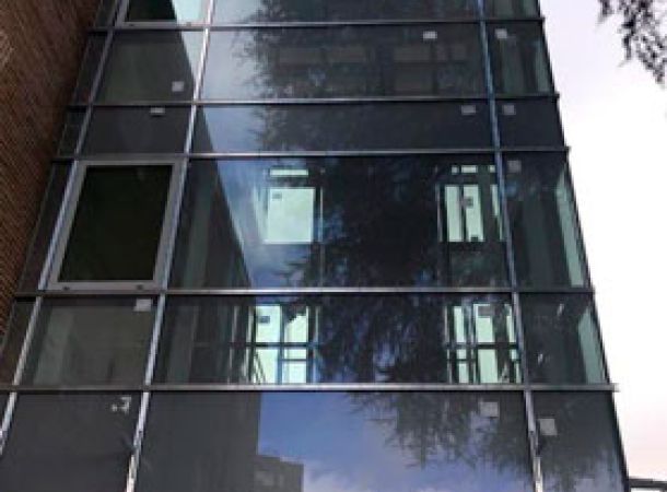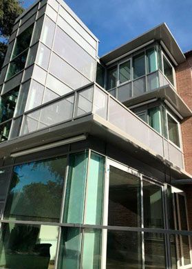 La actuación supone la introducción de una fachada técnica de vidrio de altas prestaciones, con unos materiales muy neutros y permeables visualmente, integrándose con el edificio existente y con el entorno natural que lo rodea.